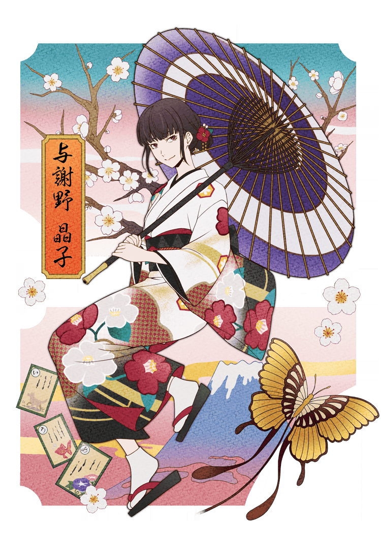 Yosano Akiko celebrating the New Year. The wind seems to carry her as she holds a large Japanese umbrella. Even the Agency's doctor appears to have found a moment's respite to celebrate the New Year and entertain herself by flying kites and playing karuta with Rampo and the others.